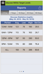 The Glucose Statistics report shows your average, low and high glucose readings, along with standard deviation within 6 hour time periods. You can choose the last 1, 7, 14, 30 or 90 days.