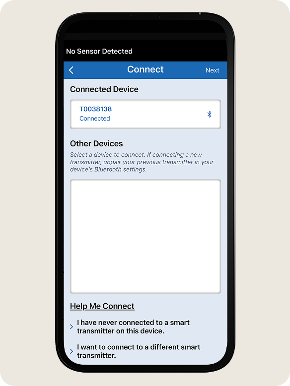 • The smart transmitter serial number and Connected will be displayed under Connected Devices once the pairing is complete. You will be redirected to the My Glucose screen.